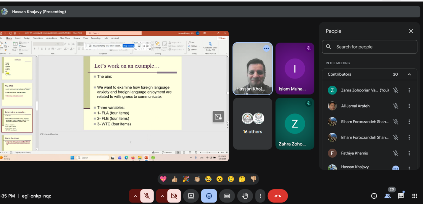 قدمت هذه الورشة مقدمة مبسطة حول النمذجة بالمعادلات الهيكلية (SEM) للباحثين في مجال التربية، حيث تناولت المفاهيم الأساسية والتطبيقات العملية باستخدام برنامج JASP، وهو برنامج إحصائي مجاني وسهل الاستخدام. كما تعرّف المشاركون على كيفية اختبار نماذج القياس (التحليل العاملي التوكيدي) والنماذج الهيكلية (النمذجة بالمعادلات الهيكلية)، بالإضافة إلى كيفية تفسير المخرجات