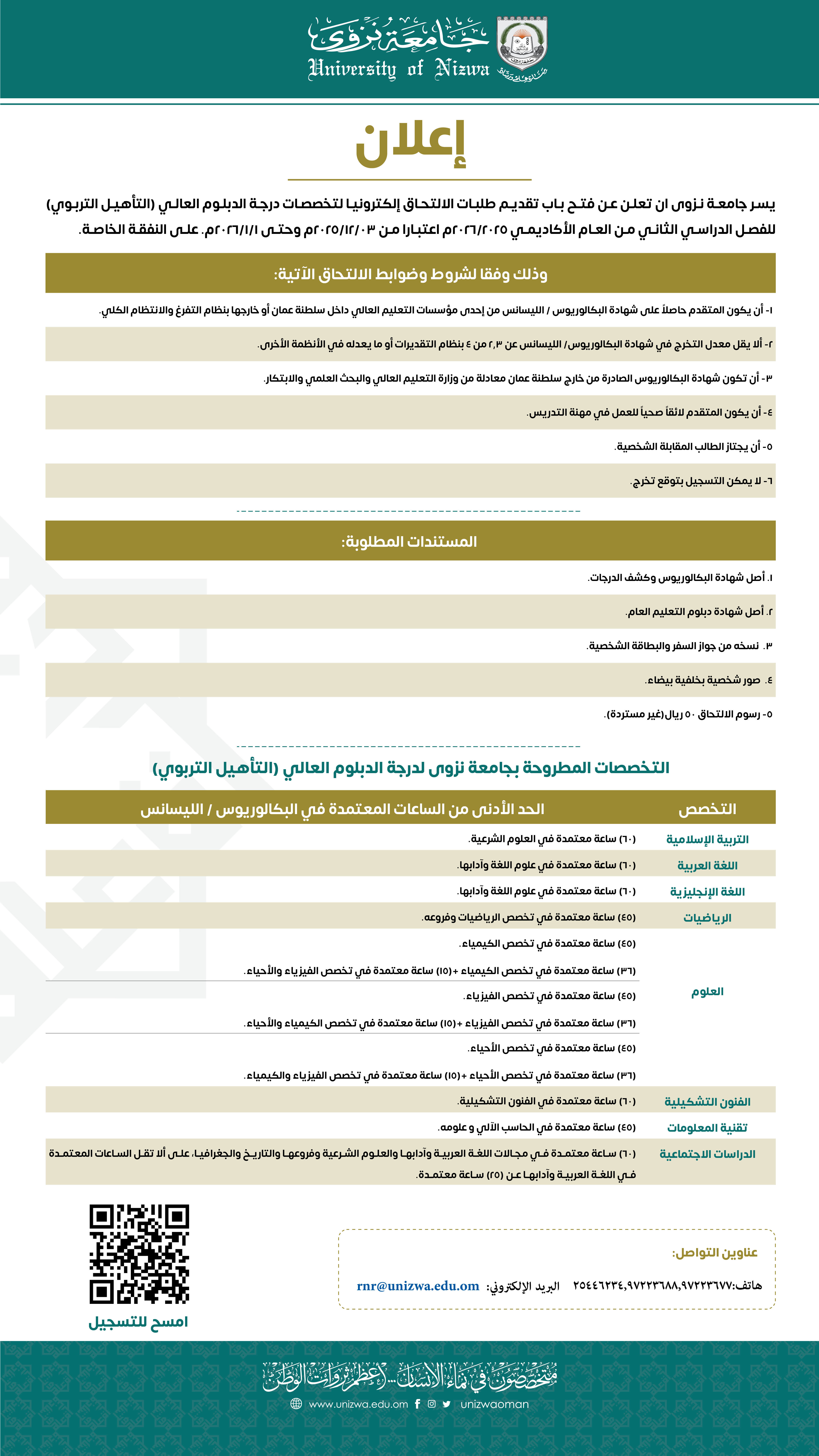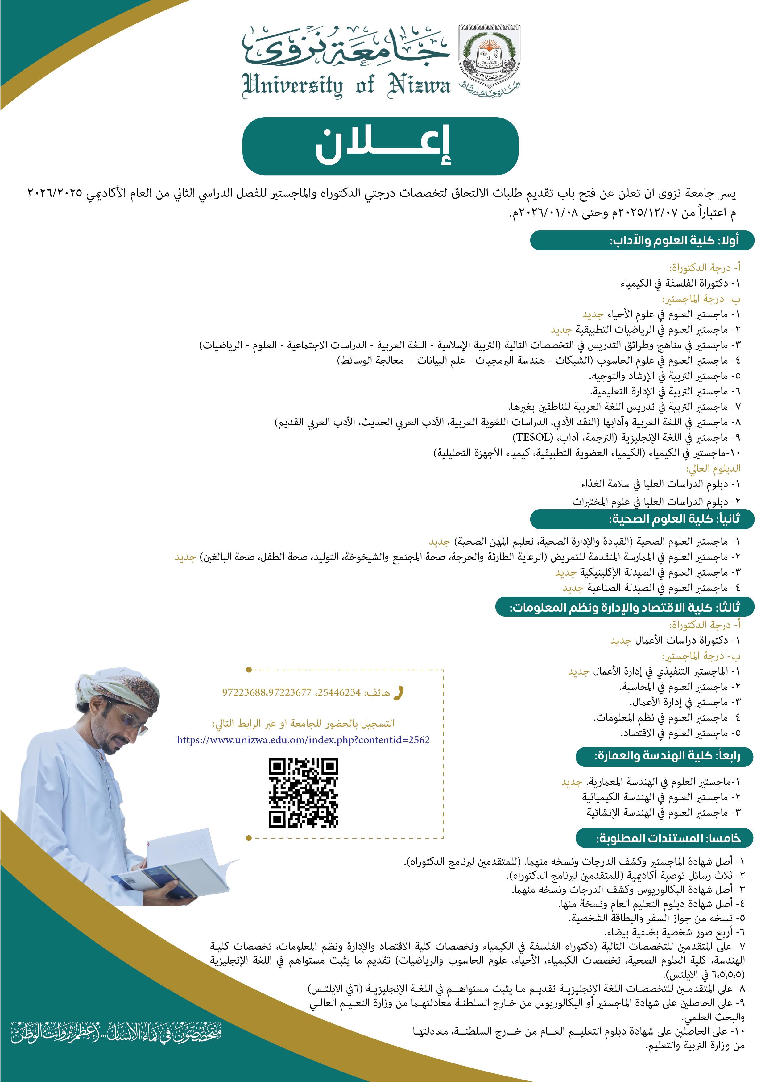 اعلان الالتحاق لتخصصات درجتي الدكتوراه والماجستير للفصل الدراسي الثاني من العام الأكاديمي ٢٠٢٦/٢٠٢٥
