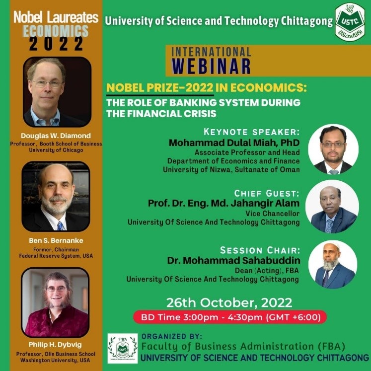 International webinar organized by the University of Science and Technology Chittagong on October 26, 2022. Dr. Mohammad Dulal Miah, Head Department of Economics & Finance attended as a Keynote Speaker.
