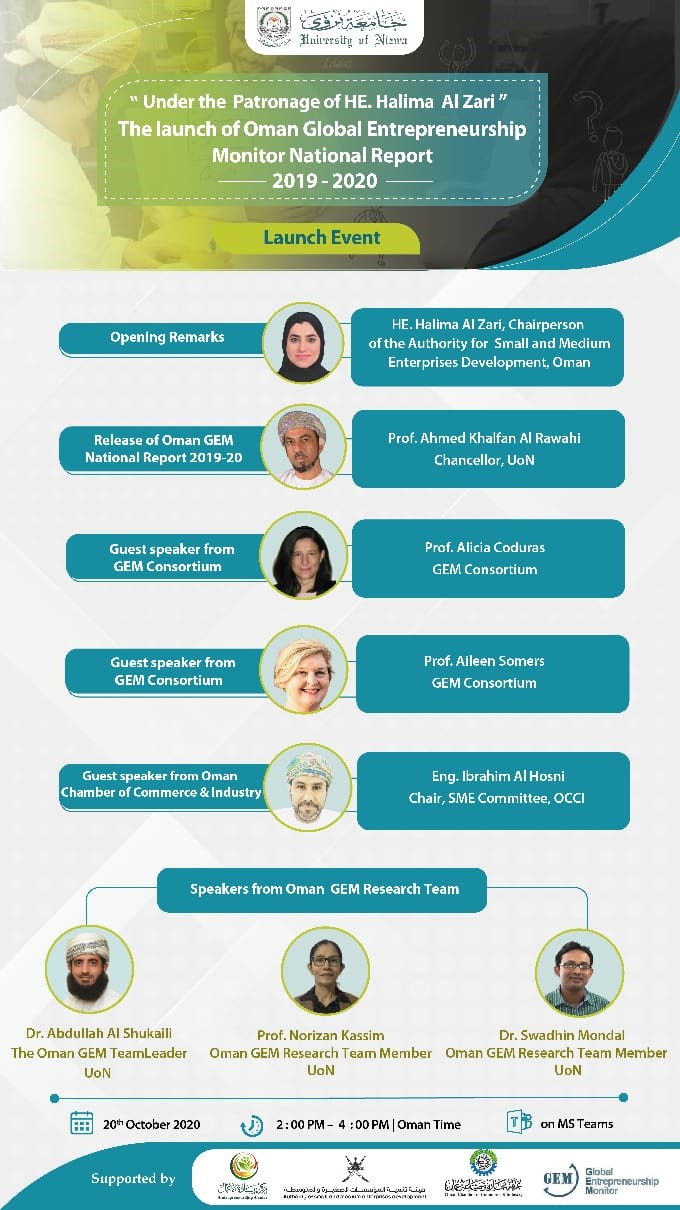 The Chief Guest for the event is Her Excellency, Halima Al Zari, the Chairperson of the Authority or Small and Medium Enterprises Development of Oman. Prof. Ahmed bin Khalfan Al Rawahi, Honourable Chancellor of the University of Nizwa, released the Oman GEM National Report 2019-2020.