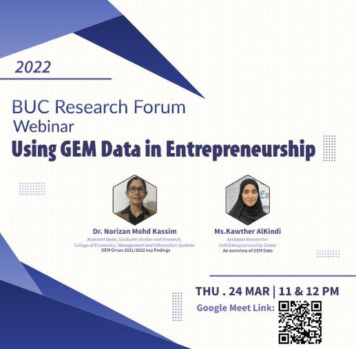 A workshop on "Using GEM Data in Entrepreneurship" was conducted online at Buraimi University College Research Forum on Thursday, March 24, 2022, from 11-12 PM.