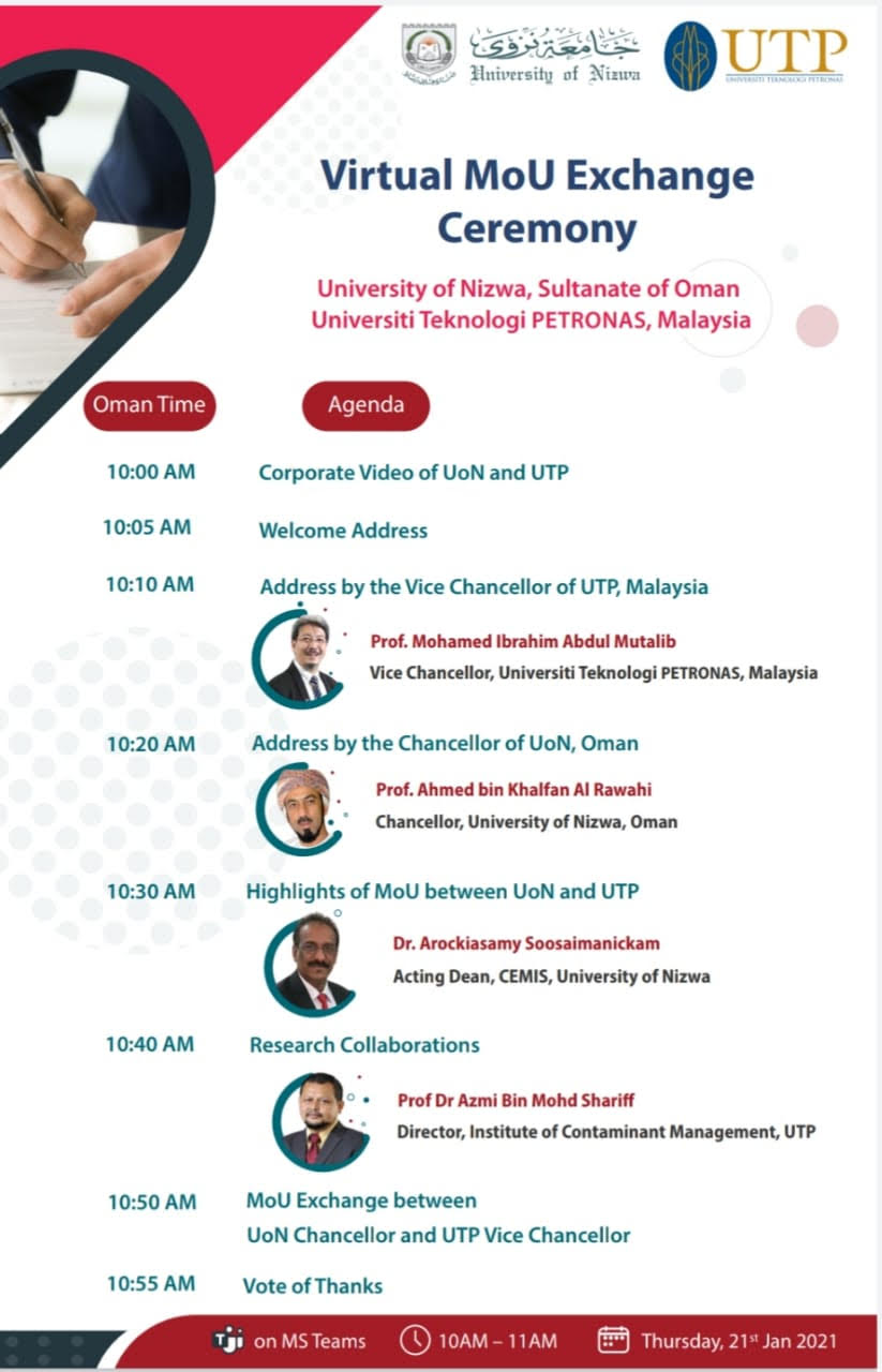A virtual MoU between the University of Nizwa (UoN) and Universiti Teknologi PETRONAS (UTP) was held on January 21, 2021, at 11 am hosted by the UTP through the Microsoft Teams platform.