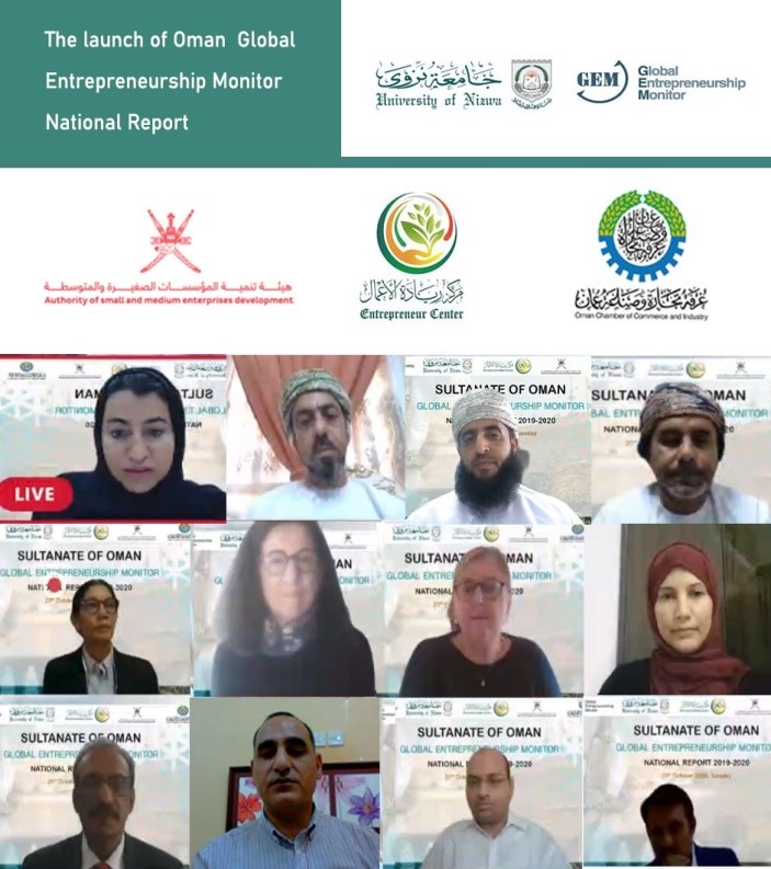 The College of Economics, Management and Information Systems, University of Nizwa organized a Webinar to launch the first “Oman Global Entrepreneurship Monitor National Report”, which was held on 20th October 2020. The Global Entrepreneurship Monitor (GEM) is a networked consortium of national country teams primarily associated with top academic institutions that collect data on entrepreneurship and entrepreneurship ecosystems, directly from individual entrepreneurs and through a population survey around the world.