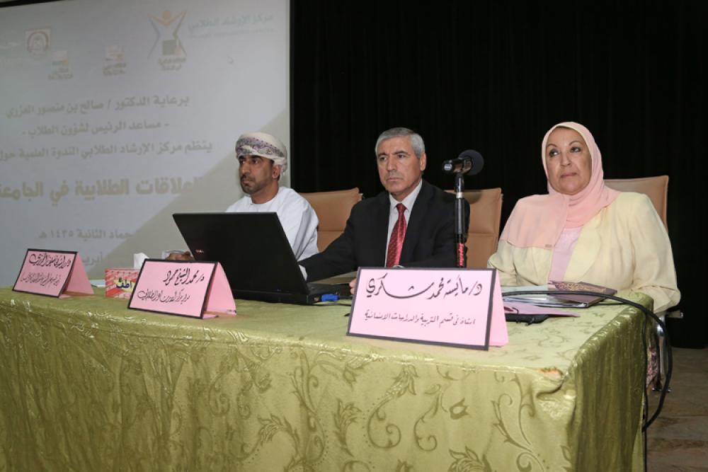 كتبت/ندى بنت راشد الجابرية: نظم مركز الإرشاد الطلابي يوم أمس الأحد (12/4/2015م) ندوة علمية بعنوان" العلاقات الطلابية في الجامعة" وذلك تحت رعاية الدكتور صالح بن منصور العزري-مساعد الرئيس لشؤون الطلاب- . وقد استهلت الندوة بآي من الذكر الحكيم، تبعته كلمة ترحيبية للدكتور صالح العزري رحب فيها بالحضور وبمقدمي الأوراق البحثية في الندوة، ثم قدم عرض مصور لمجموعة من اللقاءات التي أجرها مركز الإرشاد الطلابي حول الندوة تناولت الحديث عن العلاقات الآمنة بين الطلاب والعلاقة بين الطالب وأستاذه وكذلك علاقة الطالب بالإداريين في المؤسسة التعليمية. بعد ذلك بدأت الندوة أعمالها، و كانت أول ورقة بحثية الدكتورة مايسة محمد شكري- أستاذة في الإرشاد النفسي بالجامعة- تناولت فيها الحديث عن العلاقات المتبادلة بين الطلاب ومفهوم العلاقات البينشخصية وأهميتها مؤكدة على أن الدعم الذي يقدمه الطالب لزميله هو أقوى ما يمكن أن يخلص الطالب من السلوكيات السلبية التي يعاني منها كالإدمان على التدخين وغيره، موضحة أن أسس اختيار الأصدقاء قائمة على أوجه التشابه في الشخصيات، والاختلاف الذي يسبب التكامل، والتقارب المكاني الذي يلعب دورا بارزا في اكتساب الأصحاب. أما الورقة الثانية للندوة فقد كانت حول العلاقات الإيجابية بين الطلاب وأساتذتهم للدكتور راشد بن سيف المحرزي –رئيس قسم علم النفس بجامعة السلطان قابوس- تناول فيها الحديث عن خصائص هذه العلاقة و أهمية الاحترام المتبادل بين الطرفين، وكيف يجب أن تكون علاقة سامية لها حدودها التي لاتتجاوزها، مشيرا إلى أن هناك العديد من الفوائد التي يجنيها الطالب من وراء ذلك، واضعا مجموعة من التوجيهات لكل من المعلم والطالب من أجل بناء علاقة إيجابية سليمة. وتفضل الدكتور محمد الشيخ حمود- مدير مركز الإرشاد الطلابي- بإلقاء الورقة الثالثة للندوة والتي تناولت طبيعة العلاقة بين الطلاب والادارة منطلقا في بداية حديثه من قوله تعالى "وجعلناكم شعوبا وقبائل لتعارفوا "مؤكدا أن هناك مجموعة من العلاقات البشرية و الإنسانية المكملة لبعضها البعض ،موضحا أسس العلاقة بين الطالب والإدارة القائمة على الإيمان بقيمة الطالب والتقدير والاحترام والمشاركة والتعاون وغيرها، مشيرا إلى أن العلاقات بين الطلبة والعاملين سواء كانوا معلمين أم عاملين لها تأثير إيجابي على التحصيل والتوظيف والتأهيل. واختتمت الندوة بعرض مسرحي فكاهي أوضح أسس العلاقات الطلابية وكيف يمكن بناء علاقات سليمة بين الطلاب والطالبات، ثم تم تكريم المشاركين في الندوة والمنظمين. |