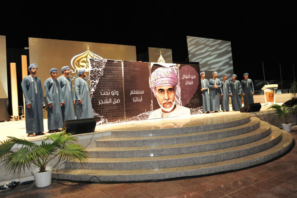 تلى ذلك بدء فعاليات المهرجان الإنشادي حيث قدمت كوكبة من منشدي السلطنة لوحة بعنوان:"الوطن" ولوحة بعنوان"صناع المستقبل" ولوحة أخيرة بعنوان" من أقوال القائد" وتخلل تقديم هذه اللوحات عرض وصلات إنشادية لضيوف المهرجان. هذا وتتواصل فعاليات المهرجان اليوم الأربعاء(21/10/2015م) من خلال أمسية إنشادية تحت رعاية معالي الشيخ عبدالملك بن عبدالله الخليلي -وزير العدل-، حيث سيقدم اليوم ثلاث لوحات إنشادية وهي لوحة "فكري حضاري" و لوحة "قابوس" ولوحة"قصة مجد". |