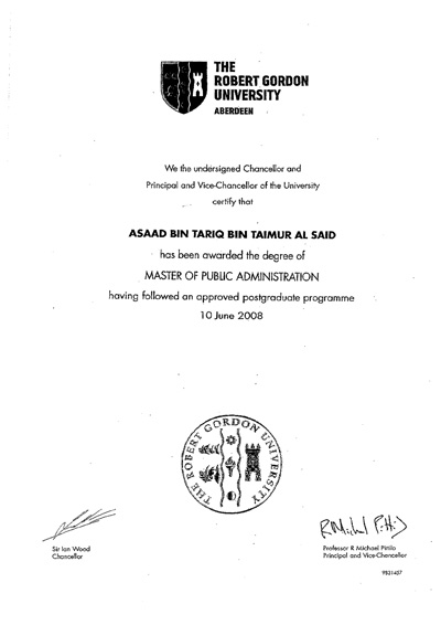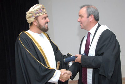 تسلمَّ صاحبُ السُّموِّ السَّيد أسعَد بن طارقِ آل سعيد – رئيسِ مجلسِ أمناء جامعةِ نزوى- اليومَ الثلاثاء (4/11/2008م) شهادةَ ماجستير في الإدارةِ العامةِ من جامعةِ روبرت جُوردن، تسلَّمها سموُّه من نائبِ رئيسِ جامعةِ روبرت غوردن، وقد تشرفتِ جامعةُ نزوى برعايةِ هذا الحدثِ في حرَمِها المبدئي ببركةِ الموز.