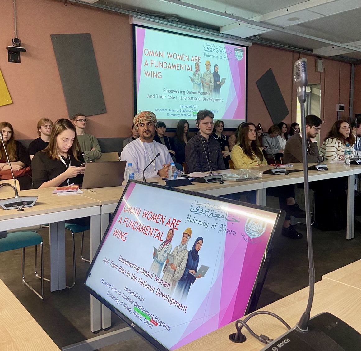 جامعة نزوى شريك استراتيجي في المؤتمر الدولي الثالث "النخب العسكرية والمجتمع في الشرق الأوسط وشمال أفريقيا" أوراق عمل تسلط الضوء على الجذور التاريخية للتنظيم العسكري في عُمان: الشراة نموذجً وورقة بعنوان "المرأة العُمانية جناح أساس: تمكين المرأة ودورها في تنمية المجتمع" و المغايبة في التراث الشعبي العُماني: تكوين خيال جماعي شاركت جامعة نزوى، ممثلةً بـ مركز الخليل بن أحمد الفراهيدي للدراسات العربية والإنسانية، كشريكٍ استراتيجي في المؤتمر الدولي الثالث "النخب العسكرية والمجتمع في الشرق الأوسط وشمال أفريقيا"، الذي ينظمه قسم الدراسات الشرق أوسطية والإفريقية بمعهد الدراسات الشرقية والإفريقية في جامعة الأبحاث الوطنية (SHE) الروسية بمدينة سانت بطرسبرغ. وقدمت الجامعة خلال المؤتمر أربع أوراق عمل بحثية تغطي محاور متنوعة، وهي: ورقة مشتركة للدكتور سليمان بن سالم بن ناصر الحسيني، مدير مركز الخليل بن أحمد الفراهيدي للدراسات العربية والانسانية، والدكتور ناصر السعدي من كرسي اليونسكو، بعنوان: "الجذور التاريخية للتنظيم العسكري في عُمان: الشراة نموذجًا ، بالإضافة الى ورقة للأستاذ حمد العزري، مساعد عميد شؤون الطلاب لبرامج الإنماء الطلابي، بعنوان: "المرأة العُمانية جناح أساس: تمكين المرأة ودورها في تنمية المجتمع" كما قدمت الدكتورة شفيقة وعيل من مركز الخليل بعنوان: "المغايبة في التراث الشعبي العُماني: تكوين خيال جماعي ، بالإضافة الى ورقة للأستاذ الدكتور نائل حنون تتناول موضوعات بحثية في التاريخ الثقافي والاجتماعي للمنطقة. وأكد الدكتور سليمان الحسيني أن هذا المؤتمر يمثّل منصة علمية رفيعة لتبادل الخبرات والمعارف بين الباحثين من مختلف الجامعات والمؤسسات الأكاديمية حول العالم، مشيرًا إلى أن أهمية المؤتمر تكمن في طرحه قضايا معاصرة تمسّ علاقة المؤسسة العسكرية بالمجتمع، وتحليلها من منظور تاريخي وثقافي واجتماعي. وقال إن حضور جامعة نزوى في هذا المحفل الدولي يأتي تعزيزًا لدورها العلمي ومكانتها في بناء جسور التعاون الأكاديمي مع الجامعات العالمية، مضيفًا أن الشراكات البحثية التي تنسجها الجامعة تعد من أبرز عوامل نجاحها في تحقيق رسالتها القائمة على الريادة والابتكار في التعليم والبحث العلمي وخدمة المجتمع. وأضاف الدكتور الحسيني أن التعاون القائم بين جامعة نزوى وجامعة الأبحاث الوطنية الروسية يشكّل نموذجًا متميزا في الانفتاح الأكاديمي وتبادل الخبرات، موضحًا أن هذه الشراكة أثمرت مشاريع بحثية مشتركة، وتبادلات أكاديمية بين الباحثين والطلبة، وتنظيم ندوات ومؤتمرات متخصصة في مجالات التاريخ والثقافة والعلوم الإنسانية. وأشار مدير مركز الخليل بن أحمد الفراهيدي للدراسات العربية والانسانية إلى أن المسؤولين في جامعة الأبحاث الوطنية عبروا عن ارتياحهم الكبير لهذه الشراكة، مثمنين الجهود التي تبذلها جامعة نزوى في بناء علاقات متوازنة قائمة على الاحترام المتبادل والرؤية المشتركة لتطوير التعاون البحثي والأكاديمي. وتابع الدكتور في حديثه قائلاً: "ما يميز مشاركة جامعة نزوى هذا العام هو تنوّع أوراق العمل التي تقدم من باحثين من تخصصات متعددة، الأمر الذي يعكس غنى التجربة الأكاديمية في الجامعة، وقدرتها على تناول القضايا البحثية من زوايا مختلفة. كما شهدنا تفاعلًا إيجابيا من المشاركين في المؤتمر مع ما قدمه باحثونا، سواء من حيث أهمية الموضوعات المطروحة أو منهجية العرض والتحليل، وهو ما يعكس مستوى التطور الذي وصلت إليه الجامعة. وأوضح الدكتور سليمان الحسيني في ختام تصريحه أن هذا المؤتمر يُعدّ الثالث الذي يُنظَّم بالتعاون مع مركز الخليل بن أحمد الفراهيدي، بعد نجاح المشاركات السابقة التي قدّم خلالها المركز أوراقًا علمية نالت إشادة واسعة من الباحثين. وأضاف أن هذا الحضور الفاعل يُجسّد حرص الجامعة على التعريف بسلطنة عُمان ومقوماتها الثقافية والاقتصادية والسياحية، وتأكيد حضورها كمؤسسة أك