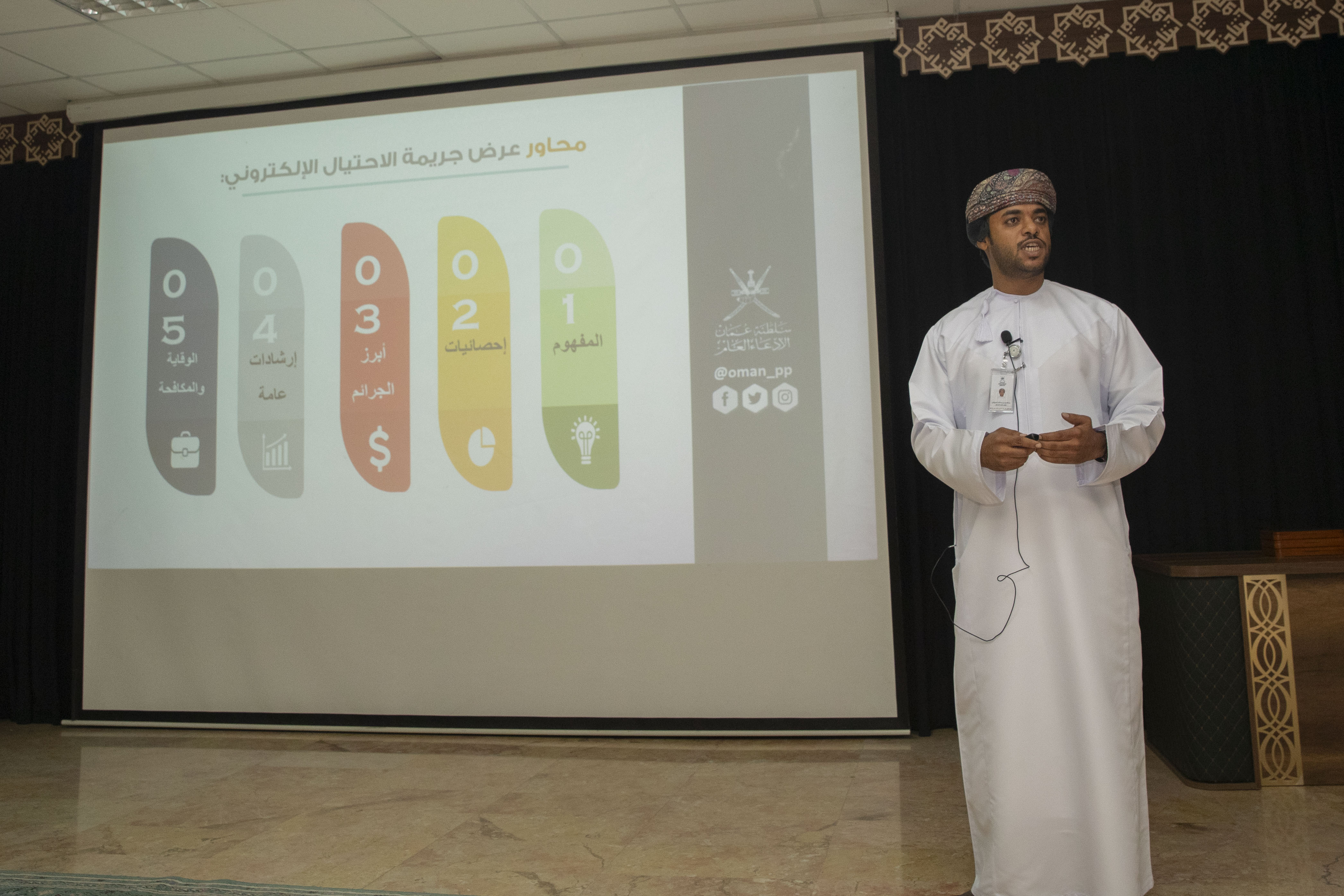 وتضمنت الفعالية أوراق عمل قدمها كل من الفاضل عبد المجيد بن عبد الله المزروعي وكيل ادعاء عام أول، حول الاحتيال الإلكتروني، والرائد خالد بن محمد الرواحي – مساعد مدير إدارة مكافحة الجرائم الاقتصادية بشرطة عمان السلطانية، حول الابتزاز الإلكتروني.