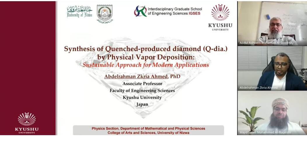 نظّمت شعبة الفيزياء بقسم العلوم الرياضية والفيزيائية بكلية العلوم والآداب بجامعة نزوى، يوم الثلاثاء، 21 أكتوبر 2025م، ندوة علمية عبر الاتصال المرئي بعنوان: "تخليق الألماس المنتج بالتبريد السريع (Q-dia) بواسطة الترسيب الفيزيائي بالبخار: نهج مستدام للتطبيقات الحديثة". أدار الندوة الدكتور ماجد بن سالم الرقيشي، رئيس شعبة الفيزياء، وقدّمها الأستاذ الدكتور عبد الرحمن زكريا أحمد، أستاذ الهندسة المشارك في جامعة كيوشو باليابان. استعرض الدكتور عبد الرحمن خلال الندوة نتائج أبحاثه المبتكرة في تطوير أغشية رقيقة من النانو ألماس باستخدام تقنية الترسيب بالبلازما القوسية المحورية (Coaxial Arc Plasma Deposition)، موضحًا كيف نجح فريقه البحثي في إنتاج أغشية من الألماس المنتج بالتبريد السريع (Q-dia) عند درجة حرارة الغرفة، وهو ما يُعد إنجازًا علميًا مهمًا نحو تصنيع المواد بأساليب أكثر استدامة وكفاءة في استهلاك الطاقة. كما تطرّق الباحث إلى التطبيقات الواعدة لهذه الأغشية في مجالات الإلكترونيات، والطلاءات الطبية الحيوية، والأدوات الصناعية، مؤكدًا إمكاناتها في تطوير مواد جديدة تجمع بين الصلابة العالية والكفاءة البيئية. وقد اختُتمت الندوة بنقاش علمي مثمر شارك فيه أعضاء هيئة التدريس وطلبة القسم عاكسًا الاهتمام الكبير بهذا المجال البحثي المتقدّم وآفاقه التطبيقية في الصناعة والتقنية الحديث.