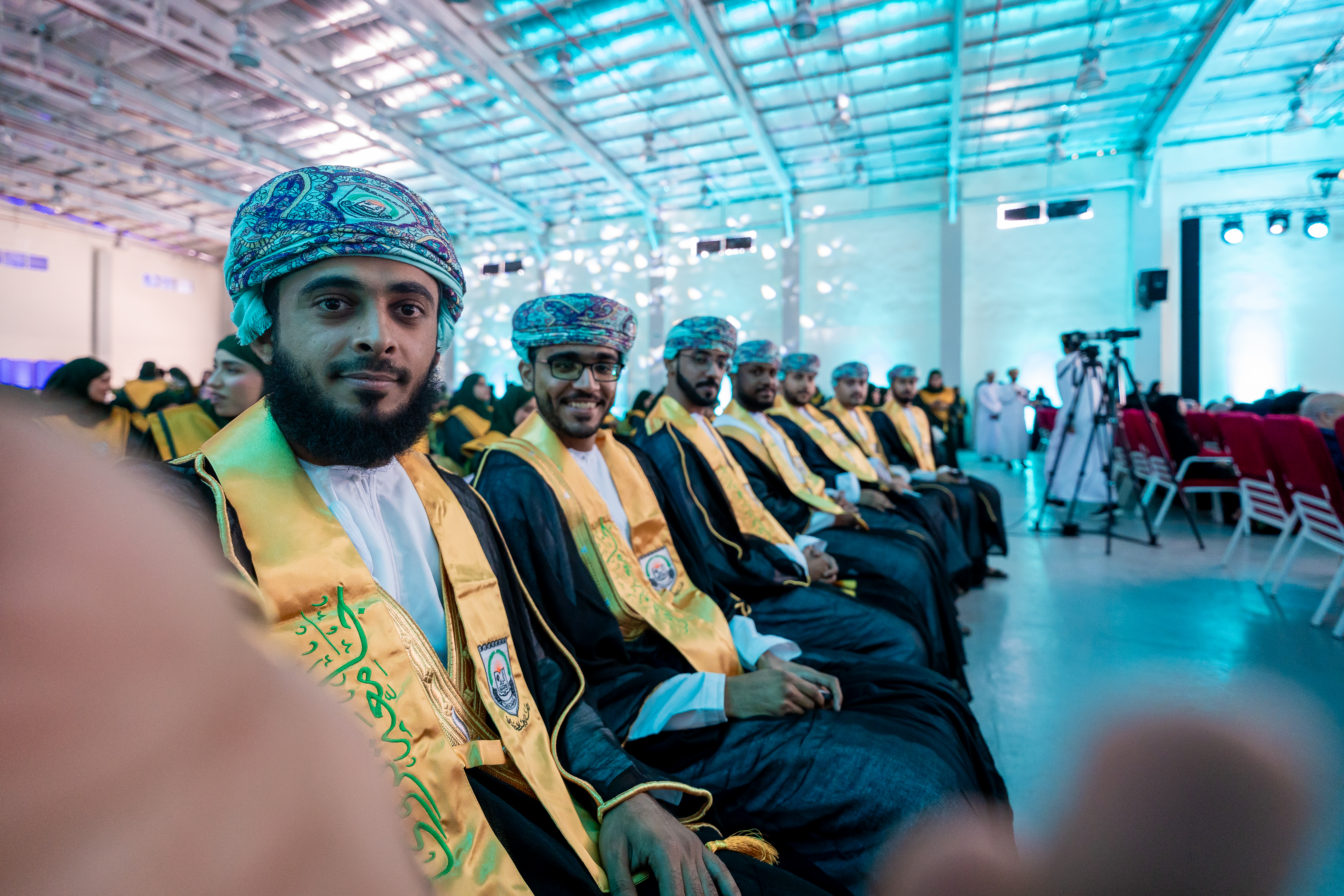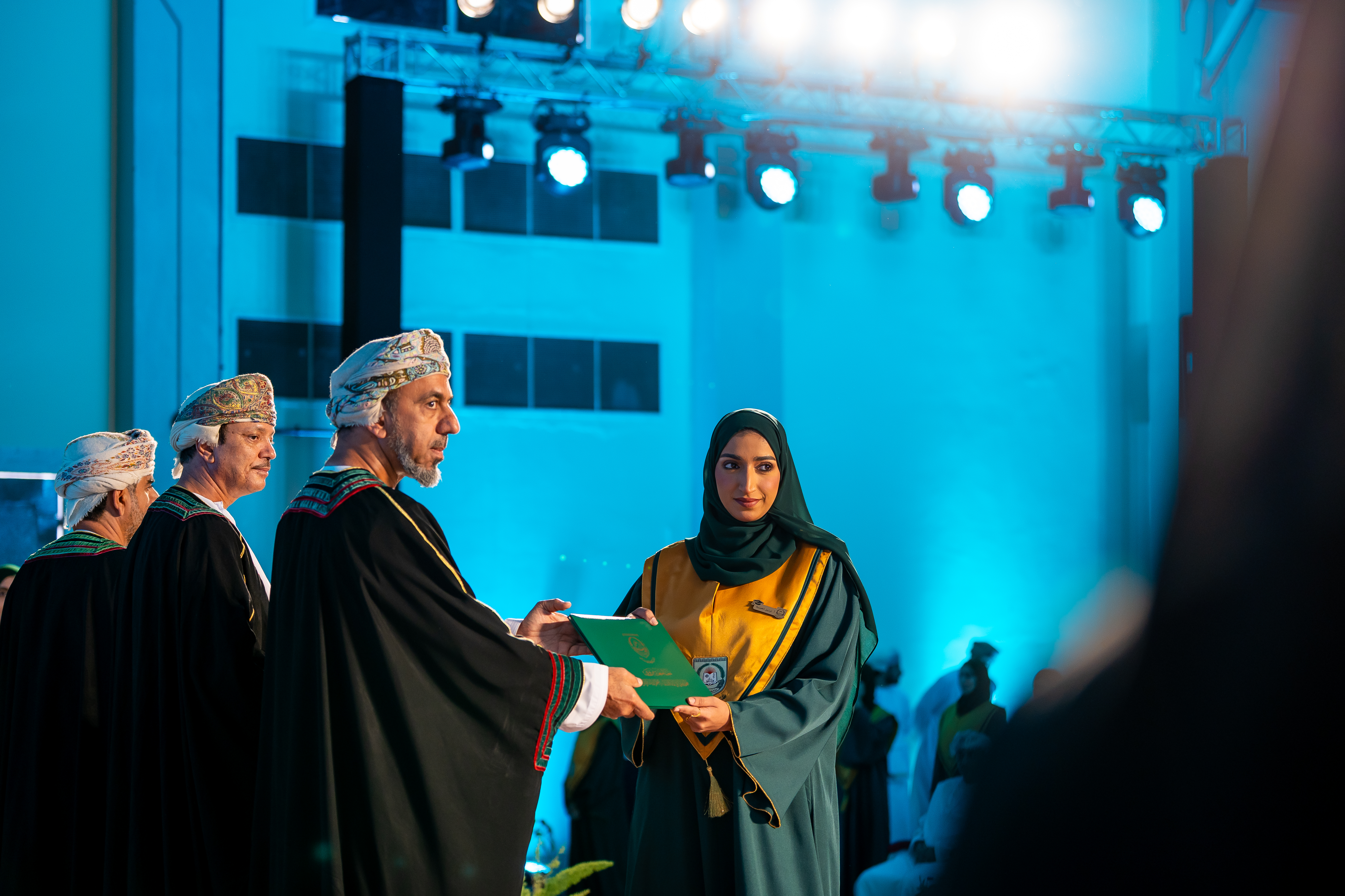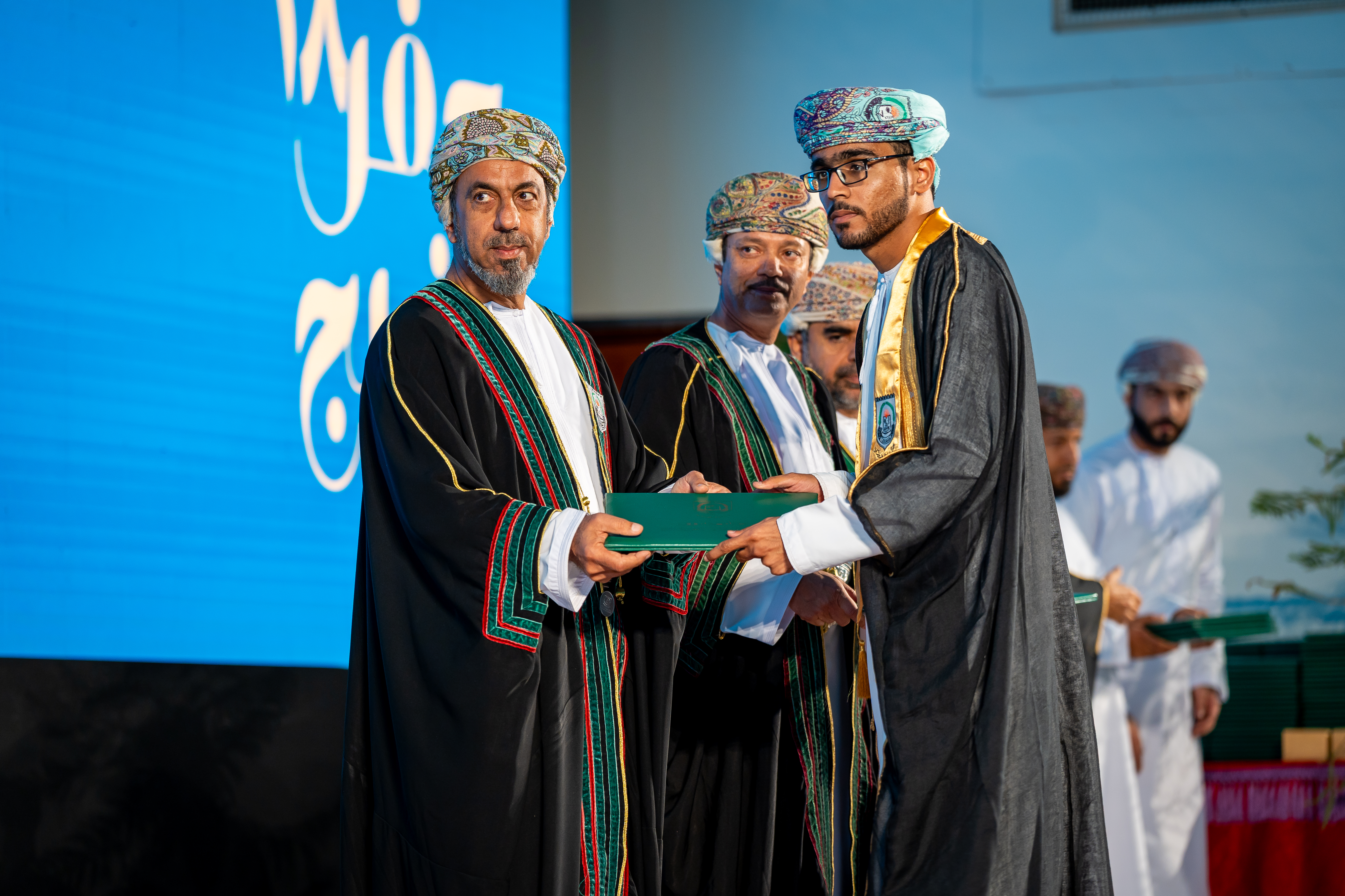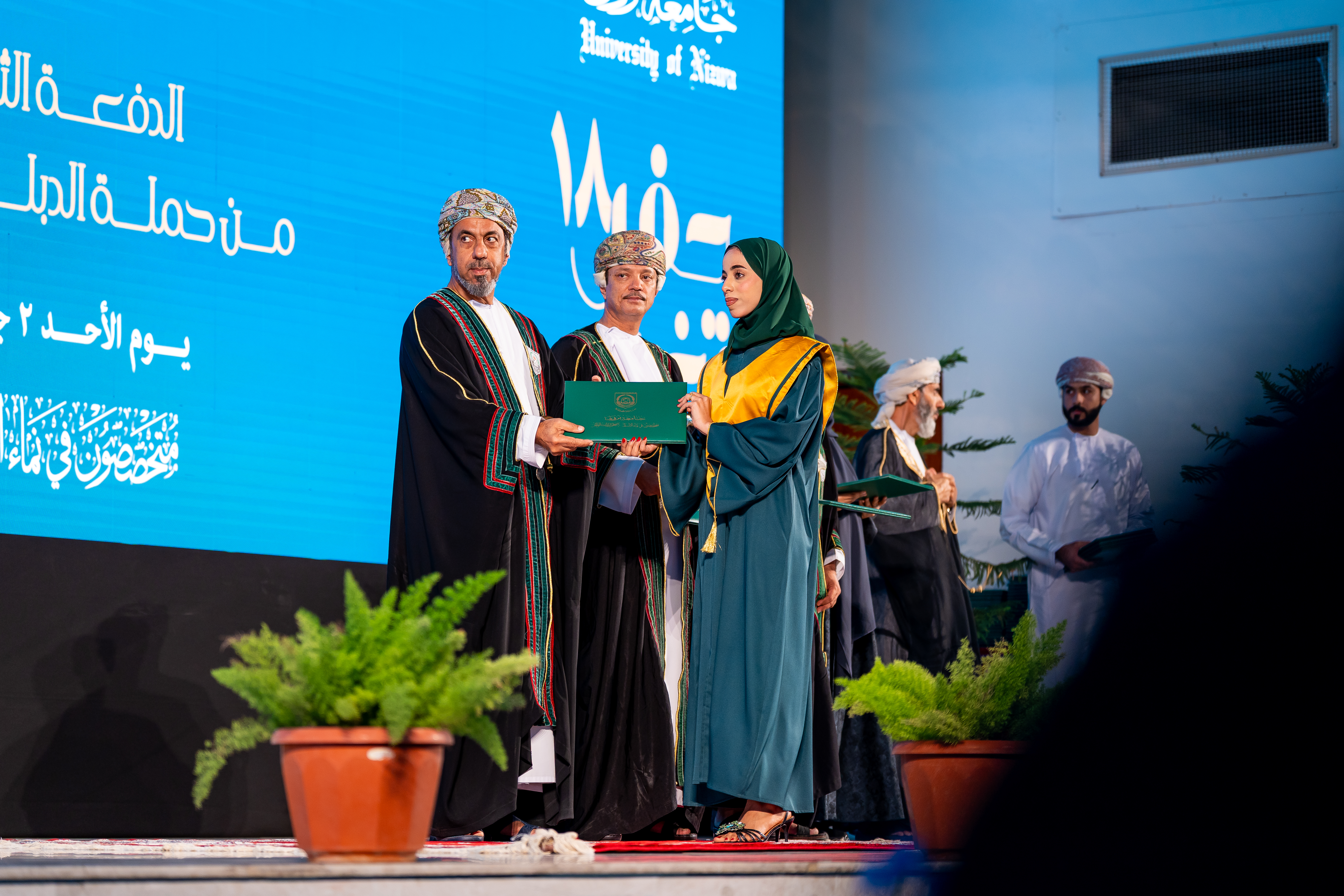 وقد رعى حفل التخريج، الذي أقيم بقاعة الحزم بالحرم المبدئي للجامعة ببركة الموز، الأستاذ الدكتور أحمد بن خلفان الرواحي رئيس الجامعة، بحضور نواب رئيس الجامعة وعمداء الكليات والكادر الأكاديمي وأولياء أمور الطلبة.