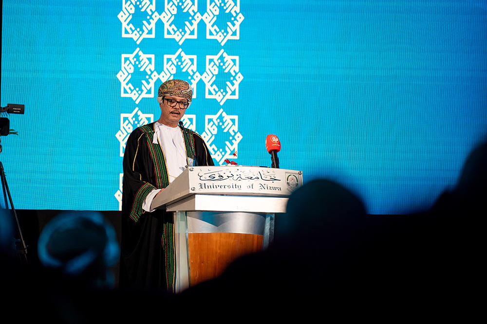 وقال في كلمته: "تتألق جامعة نزوى مواصلة الطريق لتقدم الوطن مع الإبداع وحمل الراية والسير نحو التقدم، فتمضي بعملٍ دؤوب لا يعرف اليأس أو التواني، وهي بفضل الله؛ ثم بدعم قيادتنا الرشيدة، تواصل مسيرتها مشعلًا للعلم ومنارةٍ للفكر والرشاد، تسهم في بناء الإنسان العُماني، الذي هو أغلى ثروات الوطن وأساس تقدمه. إذ تحقق الجامعة المراكز المتقدمة في التصنيفات العالمية، بما يعكس جودة برامجها وتميز بحثها العلمي، وإسهاماتها الفاعلة في تحقيق رؤية عُمان 2040، وهذا الإنجاز ثمرة شراكة حقيقية بين جميع مؤسسات الوطن، هذا هو ثمرة الجهد والتطوير المستمر والرسوخ في مجالات التعليم والبحث العلمي والابتكار، كما تستمر الجامعة في تطوير برامجها التعليمية والتأسيس لبرامج جديدة من شأنها أن تلبي متطلبات سوق العمل".