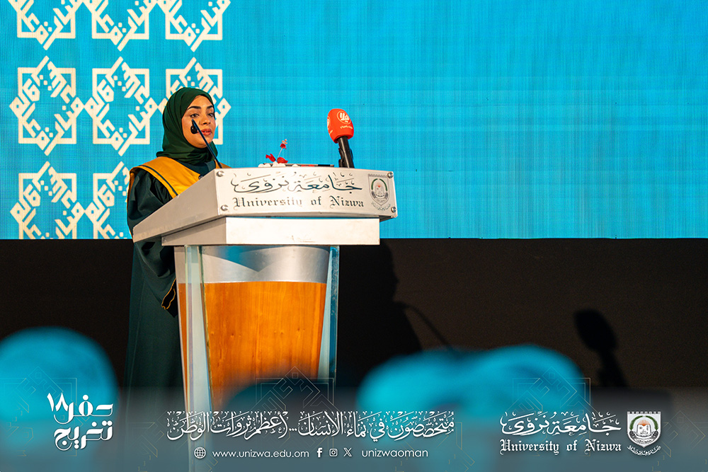 “يسرني أن أقف بين أيديكم اليوم على أعتابِ لحظةٍ طالما انتظرناها بشوق ولهفة، لحظةٍ نودّع فيها فصولًا من الجهد والمثابرة، ونقبّل فيها جبين الأيام التي علمتنا الصبر والإصرار. ها نحن نحصد ما زرعناه بين دفاتر السنين، ونقطف من بستان العلم زهرة الفخر واليقين. لقد كانت رحلتنا في جامعة نزوى رحلةً من النور، عبرنا فيها جسور الحلم، وتسلّقنا بها مراتب المجد، وتعلّمنا أن العلم لا يعطي سرَّه إلا لمن أحبّه بصدق وسعى إليه بإيمان".