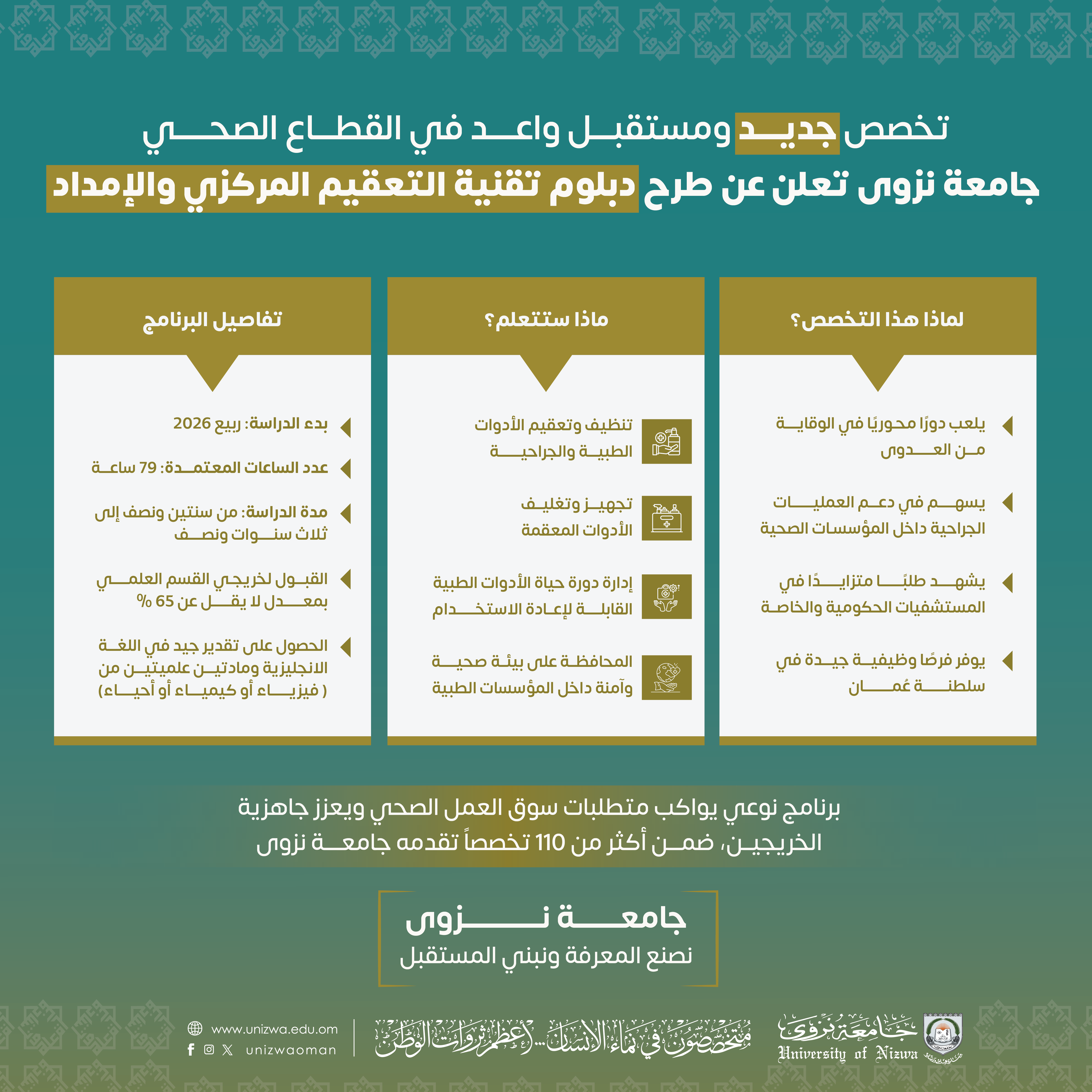 أعلنت جامعة نزوى عن طرح تخصص جديد بعنوان «دبلوم في تقنية التعقيم المركزي والإمداد»، وذلك بعد موافقة وزارة التعليم على تنفيذ البرنامج ابتداءً من ربيع 2026م. ويُعد هذا التخصص ثالث برنامج تعلن عنه الجامعة خلال شهر واحد، بعد إعلانها عن طرح ماجستير تكنولوجيا التعليم بنظام التعليم المدمج، ودكتوراة الفلسفة في المناهج وطرائق التدريس، ليضاف بذلك إلى أكثر من 110 تخصصا متاحا في الجامعة.