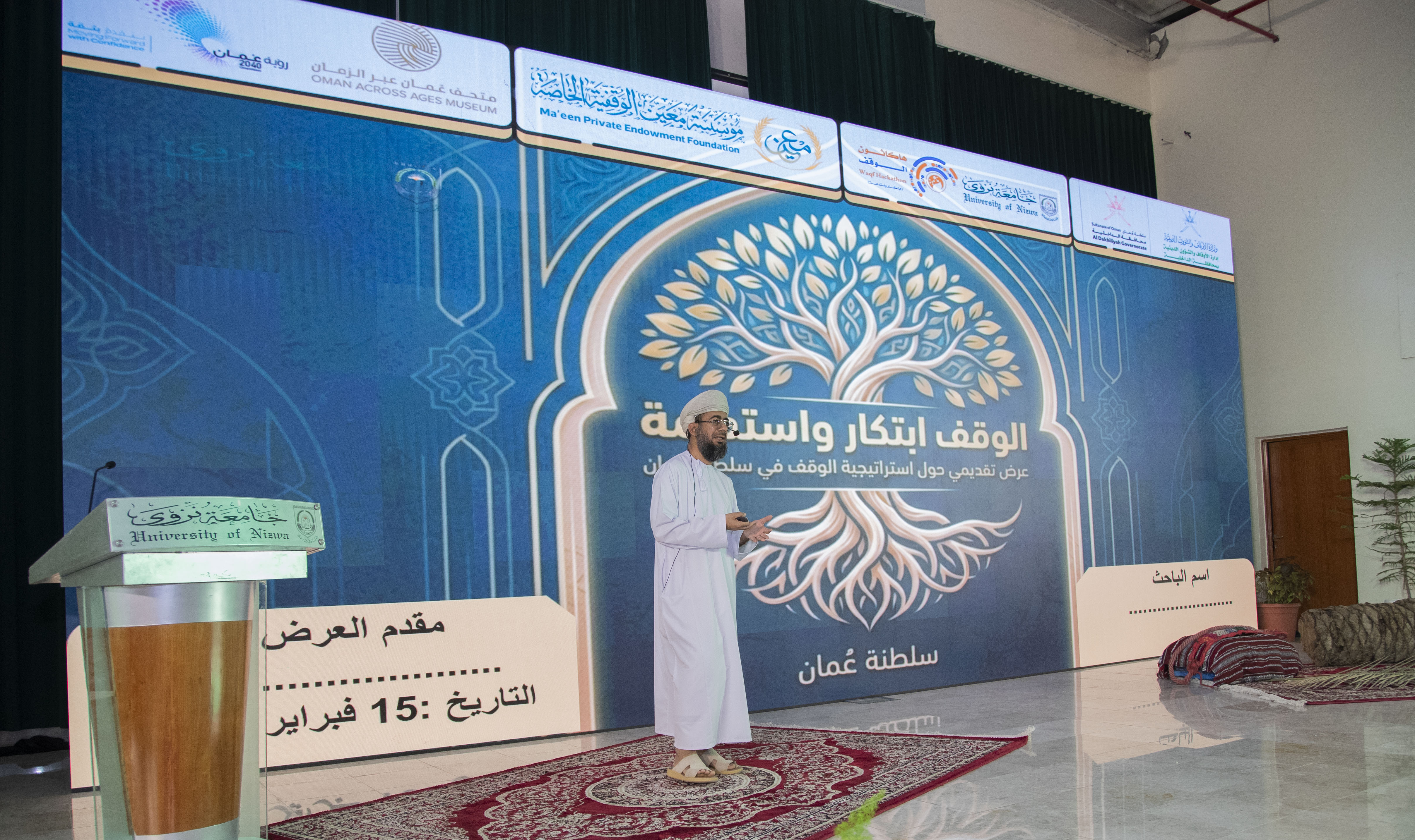 أطلقت إدارة الأوقاف والشؤون الدينية بمحافظة الداخلية، بالتعاون مع جامعة نزوى، الحملة التثقيفية لـ«هاكاثون الوقف الأول – ابتكار واستدامة»، وذلك يوم الإثنين 16 فبراير 2026م، بمشاركة عدد من طلبة الجامعات والشباب المبدعين في المحافظة.