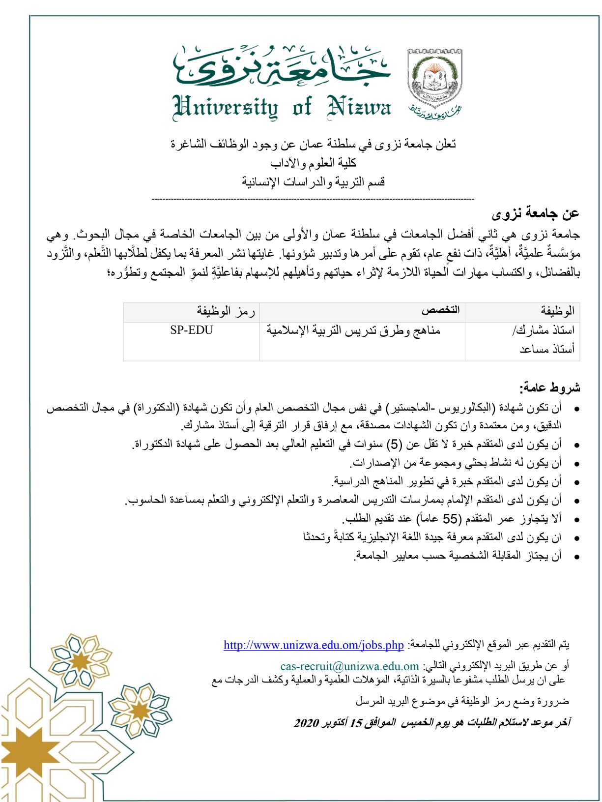 : استاذ مشارك/استاذ مساعد - مناهج وطرق تدريس التربية الإسلامية